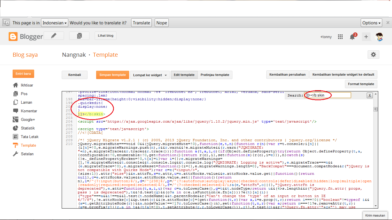 - Di edit HTML ini kita klik kan dulu "KURSOR" pada pormate tamplate , kemudian Ctrl F dan ketikan pada search ]]></b:skin> dilanjutkan dengan mengtikkan .quickedit{ dibawahya display:none:}