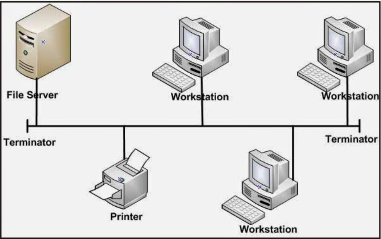 1. Topologi BusJenis topologi bus ini menggunakan kabel tunggal, seluruh komputer saling berhubungan secara langsung hanya menggunakan satu kabel saja. Kabel yang menghubungkan jaringan ini adalah kabel koaksial dan dilekatkan menggunakan T-Connector. Untuk memaksimalkan penggunaan jaringan ini sebaiknya menggunakan kabel Fiber Optic karena kestabilan resistensi sehingga dapat mengirimkan data lebih baik.